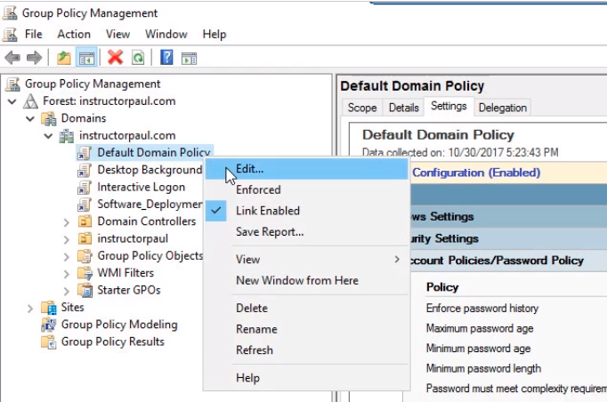 We are going to edit this policy. Right-click the Default Domain Policy and choose Edit.