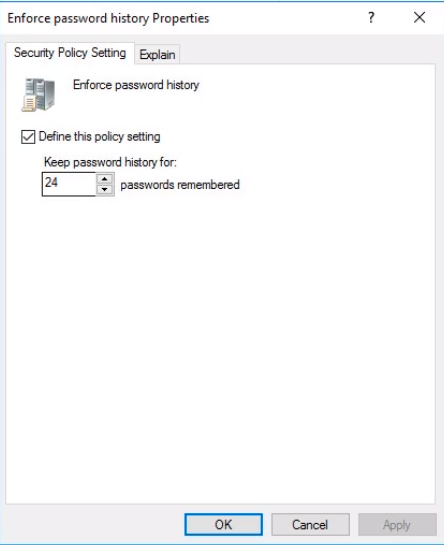 Double click on Enforce password history. This setting will remember our users' previous 24 passwords and will not allow them to reuse these passwords if they are creating a new password. We will leave it at the default since it is very much secure at that value. Click on OK.