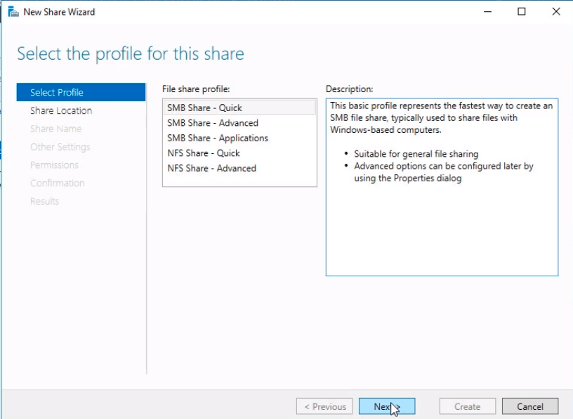 The New Share Wizard window will pop up. Select SMB Share - Quick. This is the fastest way to create a share. Click Next to continue.