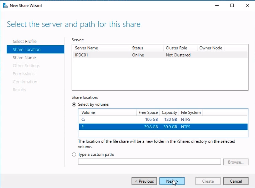 In the Select the server and path for this share window select IPDC01 and on the Share Location choose the E:\ drive and click Next.