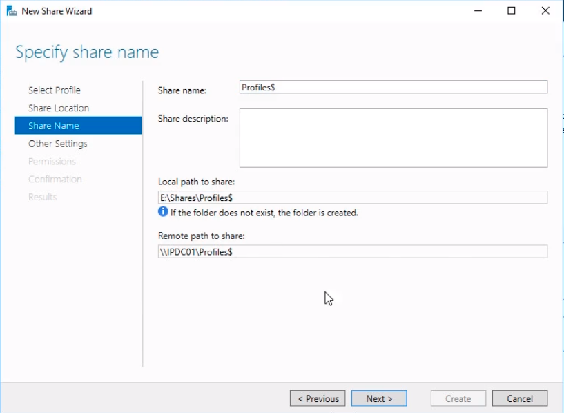Now we need to Specify share name. Type the Share Name Profiles$. The dollar sign ($) makes the folder hidden so that its not easily viewable by people browsing the share path. Click Next to continue.