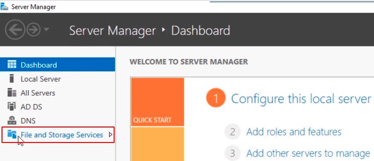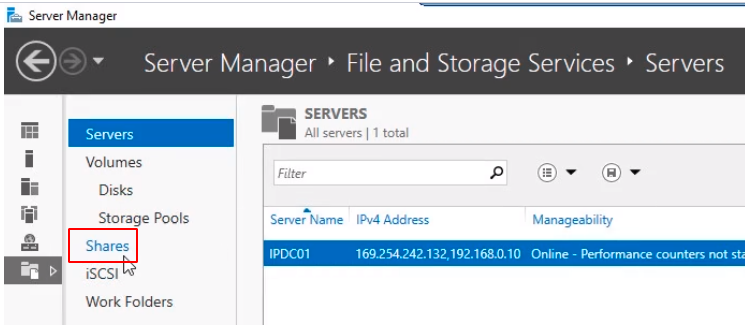 Click on File and Storage Services and then select Shares.