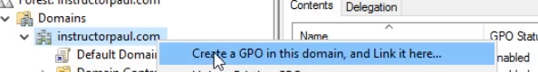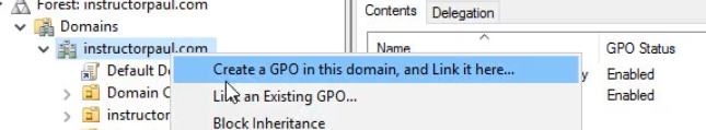 - Right click the domain and choose to Create a GPO in this domain, and Link it here...