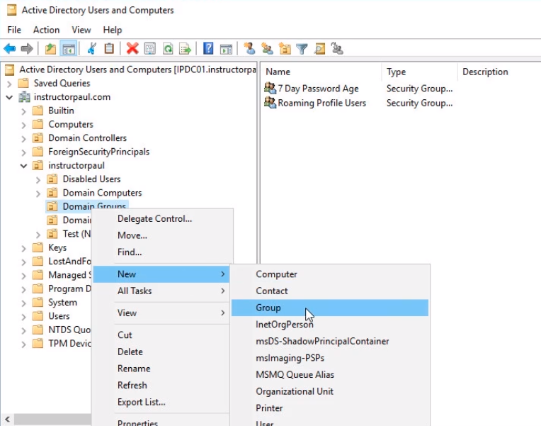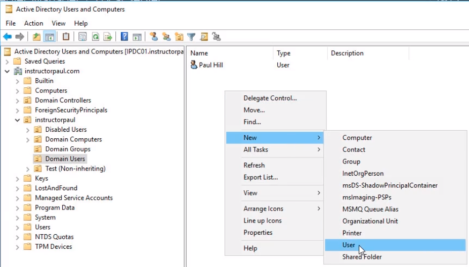 Since we just have one user, we will create another user account. Right-click Domain Users and select New > User.