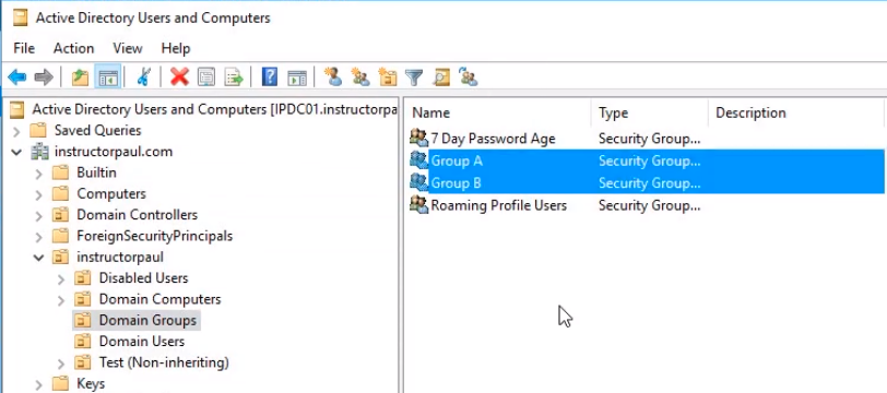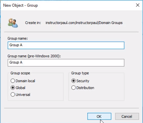 For demonstration purposes, we will call our group Group A, but in your organization might be called Sales, IT, Security, etc. It will be a Security Group and Global Group. Click OK.