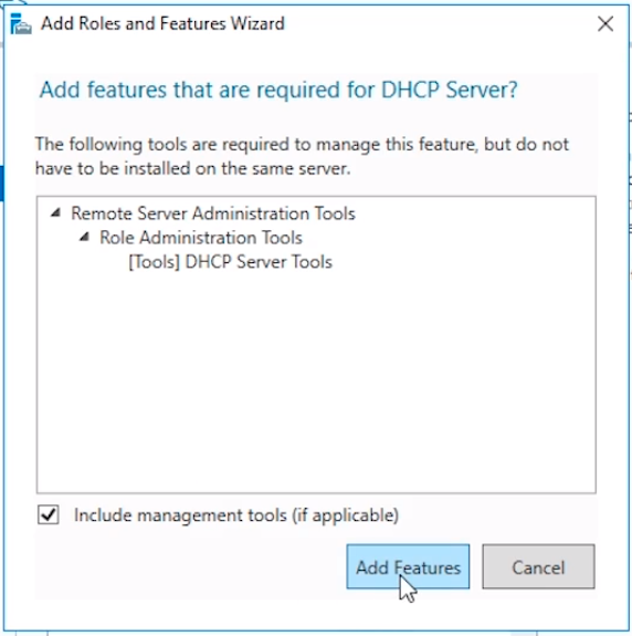 You’ll be prompted to add the Features that are required by the DHCP Server Role. Click the Add Features button to continue.