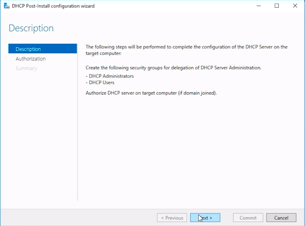 The DHCP Post-install configuration wizard window will appear. The first configuration window tells us that we will need to create the DHCP Administrators and DHCP Users security groups and authorize the DHCP server.