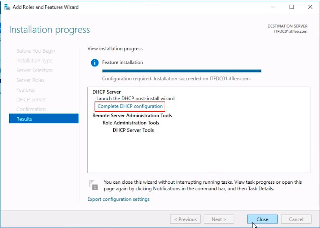 Once the installation completes, click the Complete DHCP configuration blue hyperlink.