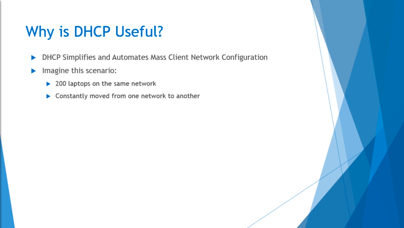 Imagine this scenario where you have 200 Laptops on the same network, and imagine that they are constantly moved between one network to another, let’s say you have an office and those employees are bringing their Laptops from office A to office B in separate networks, maybe they are separate subnets, you would have to configure the Static IP Address on those Laptops every time they are moved from one network through another, and it would be a big pain because you have to make sure you don’t hand-out and IP Address that’s already in use because you will create an IP conflict, and it just would be a lot of work.