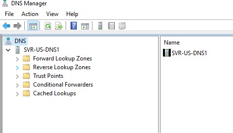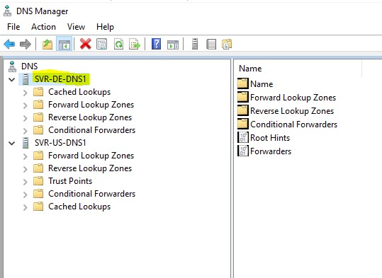 Right-click on SVR-DE-DNS1 and delete the information from this console. Left-click on the server name the following is displayed: