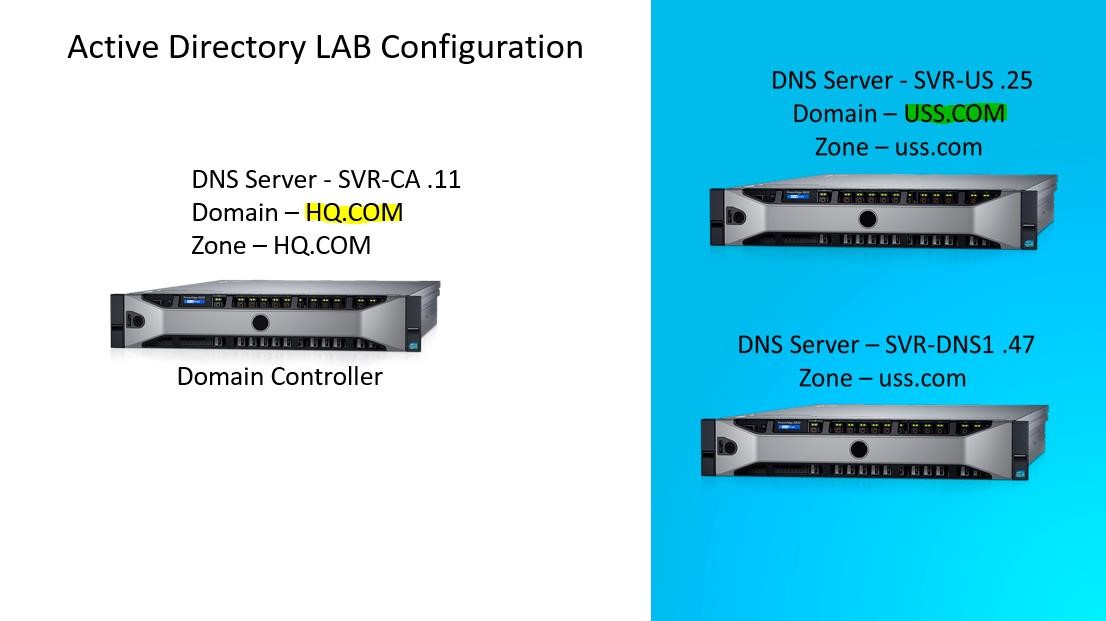 - Two of those servers should be “stand alone” domains (completely separated) I used hq.com and uss.com.
