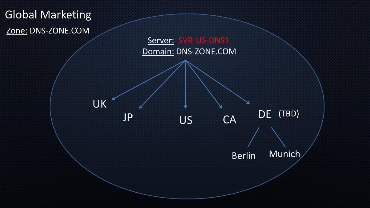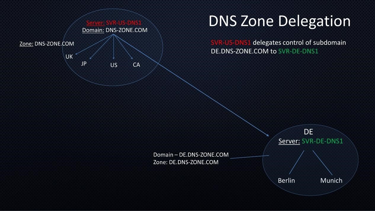 - In this slide if a request for information comes in to the US site for the site in Germany, the DNS server in the US would pass that request onto the DNS server at the DE site.