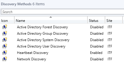 Once you are logged into your SCCM server, open the SCCM console and navigate to Administration > Hierarchy Configuration > Discovery Methods. Here we can see there are several discovery methods available: