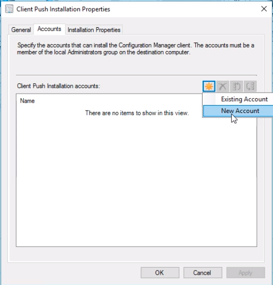 Even though we are not creating a new account, as far as the Configuration Manager is concerned, there is no account specified and we are going to do that now.