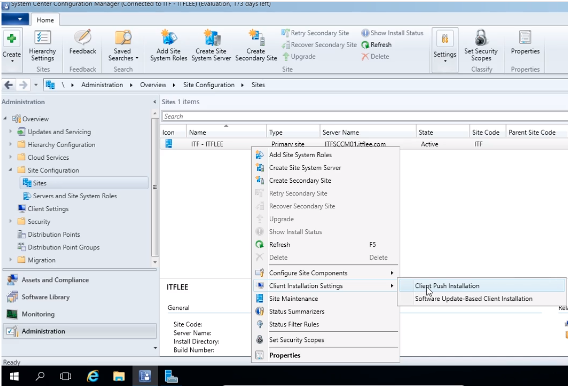 Before we attempt a client push, we need to make sure that SCCM will use a Domain Administrator account to install the client. We can do this by navigating over to the Administration tab, and selecting Site configuration, Click on Sites, and right-click on our server, and Client Installation Settings, click on Client Push Installation.