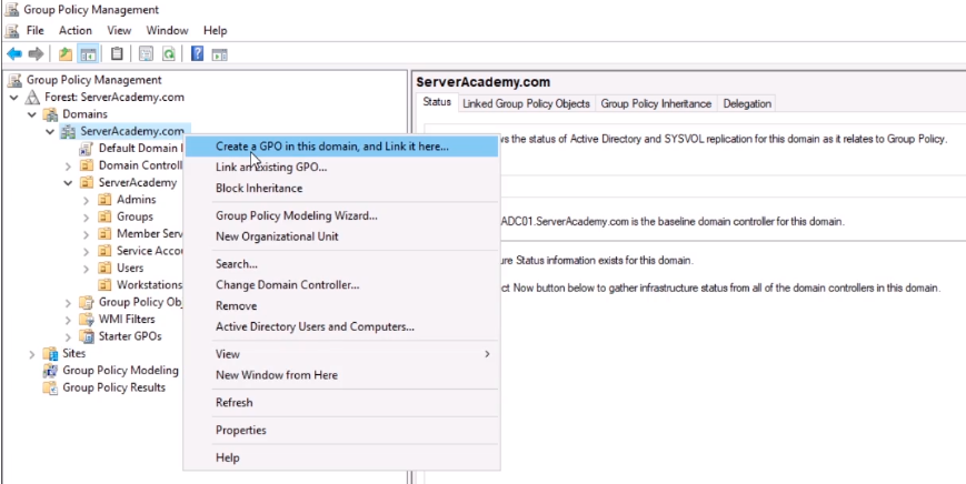 So, let’s go ahead and right-click on the root of the Domain ServerAcademy.com, and let’s select Create a GPO in this domain, and Link it here...