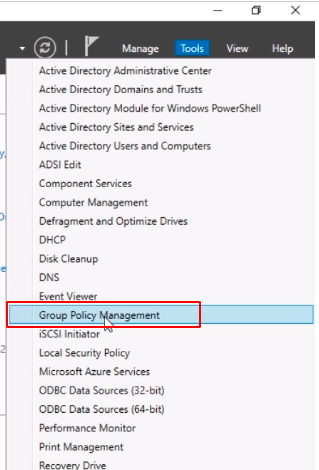 What I am going to do in Server Manager is click Tools > Group Policy Management