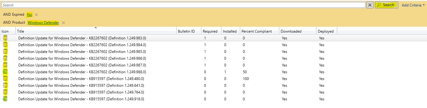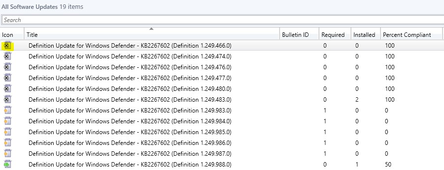 What this means is that these x’s represent outdated definitions. So, what we will want to do is filter out the irrelevant definitions and create a current list of updates for windows defender that we will send out to our Endpoint Protection clients.
