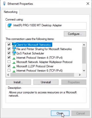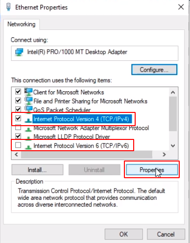 Next, we are going to uncheck IPv6 since our lab doesn’t really need to use this and we select Internet Protocol Version 4 (TCP/IPv4) and we click the Properties button.