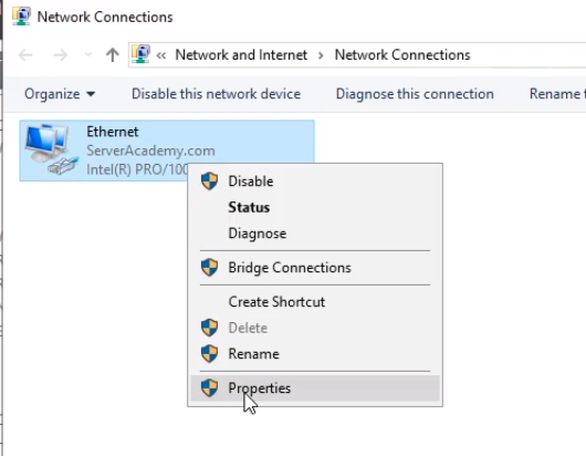 We are going to right-click over Ethernet and choose Properties.