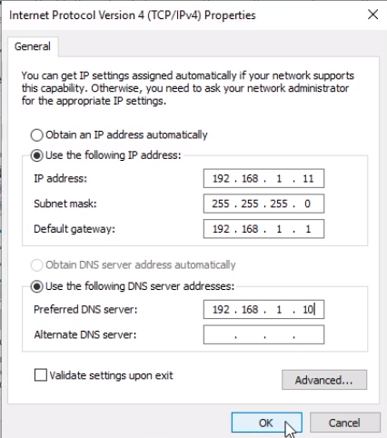 Now, our preferred DNS server is going to be the Domain Controller which is 192.168.1.10. And this is a requirement for joining our Domain since that is the DNS server for ServerAcademy.com.