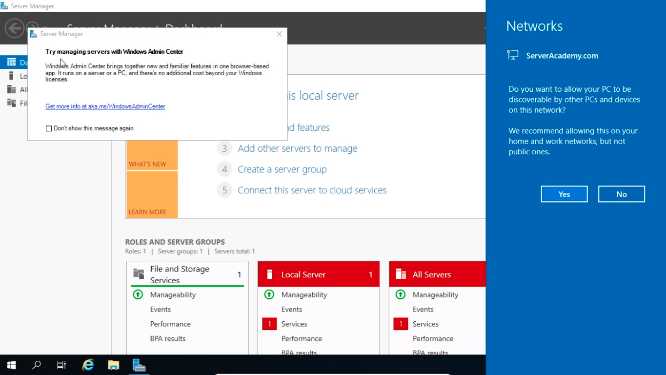 I’ve logged in to the SASCCM01 server and right away I can see that we have a popup for the Windows Admin Center, I am going to click out of that.