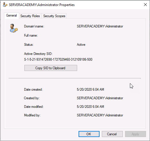 Here you will see three tabs; General, Security Roles and Security Scopes. General simply lists basic identifiable information about the user account. Security Roles allows you to define how much control you want the user or group to have. In this case, we can see that this user is a Full Administrator.