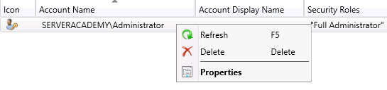Inside the right pane you will see your administrative users and groups. Here you can right-click existing users to edit, refresh or remove them: