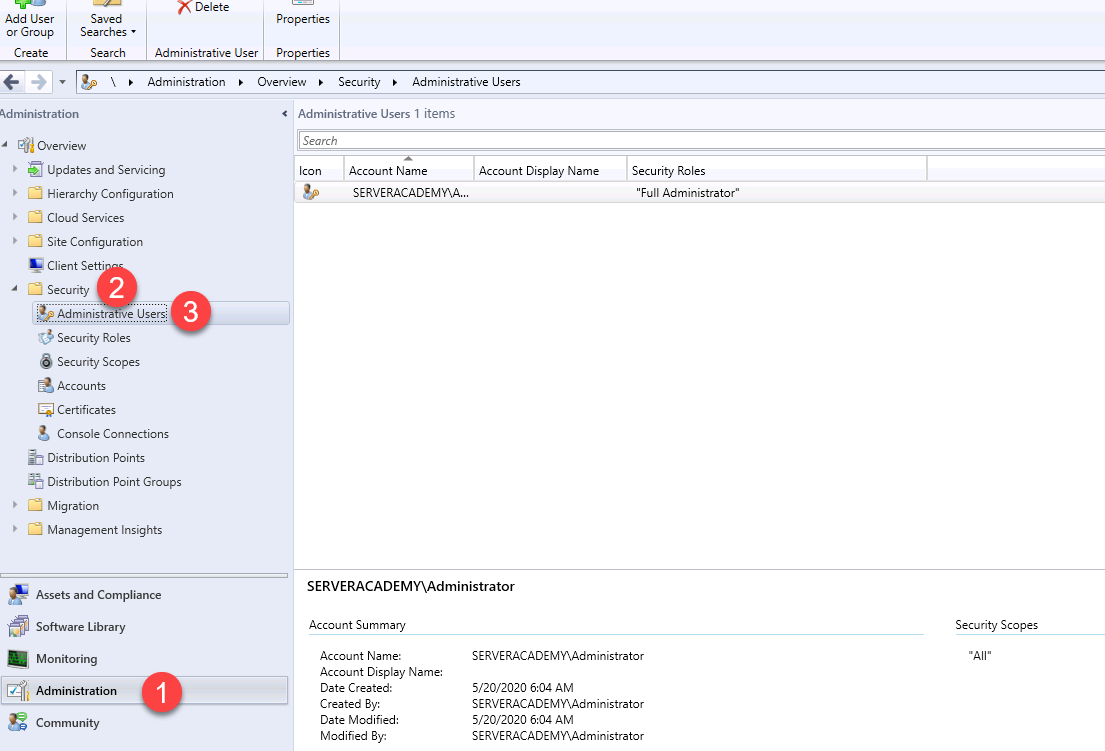 In the SCCM console, navigate to Administration > Security > Administrative Users: