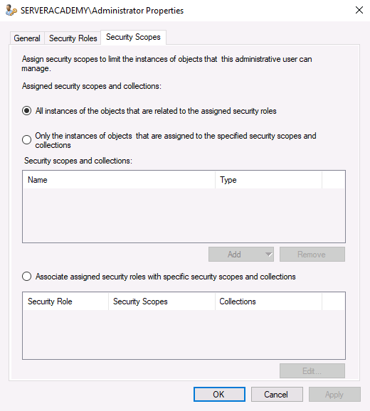 Selecting Only the instances of objects that are assigned to the specified security scopes and collections will associate the user with the Default security scope as well as the All Systems and All Users and User Groups collections. The main difference here is that this time the security scopes will be limited to that of the user account yo…