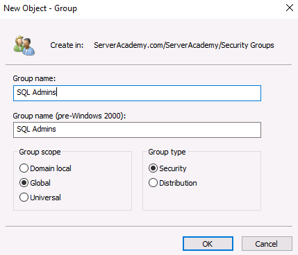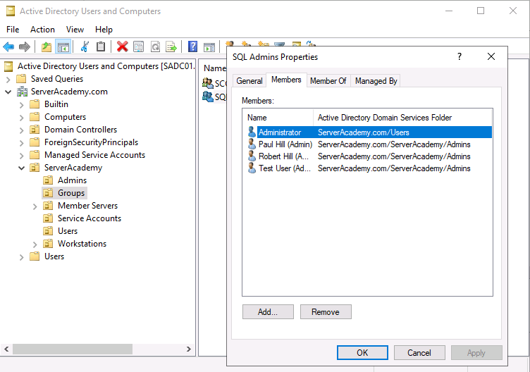 Next, open the “SQL Admins” group and add the appropriate members that you wish to be able to administrate your SQL server. I am going to include the following user accounts I have in my domain: