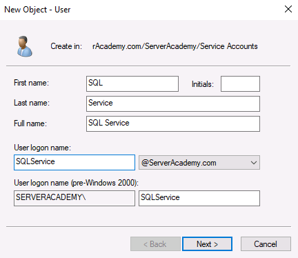 I am going to configure the users password to never expire. This is generally a bad security practice and in a real production network, you should be constantly cycling secure passwords. If you don’t check this checkbox and the account password expires then the service that uses the service account will be broken until you fix the password.