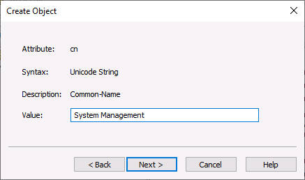 Select the container class and click Next. Under the Value textbox, enter the name “System Management”.