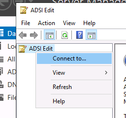 In the ADSI Edit console, right-click ADSI Edit at the top and select Connect to then click OK to connect to your domain. Usually the default settings are correct, but if you need to specify an alternate server you can before clicking OK.