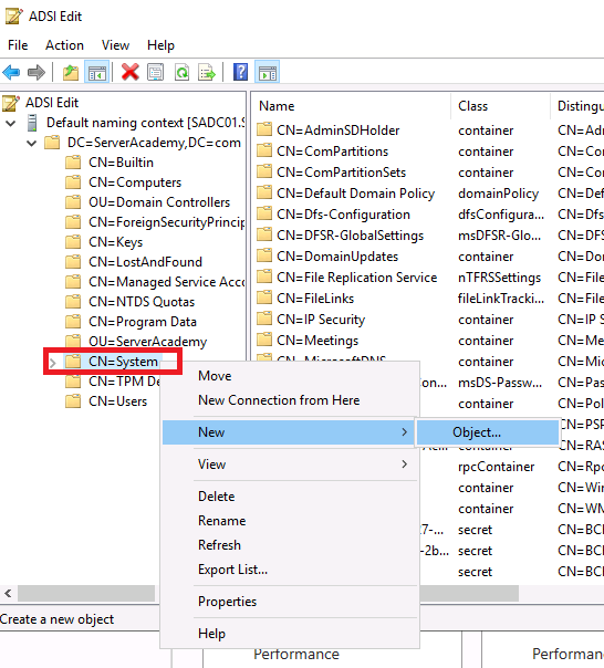 Within the left pane, left-click the “Default naming context”, then expand your domain name (in my case, serveracademy.com), right-click CN=System and select New > Object.