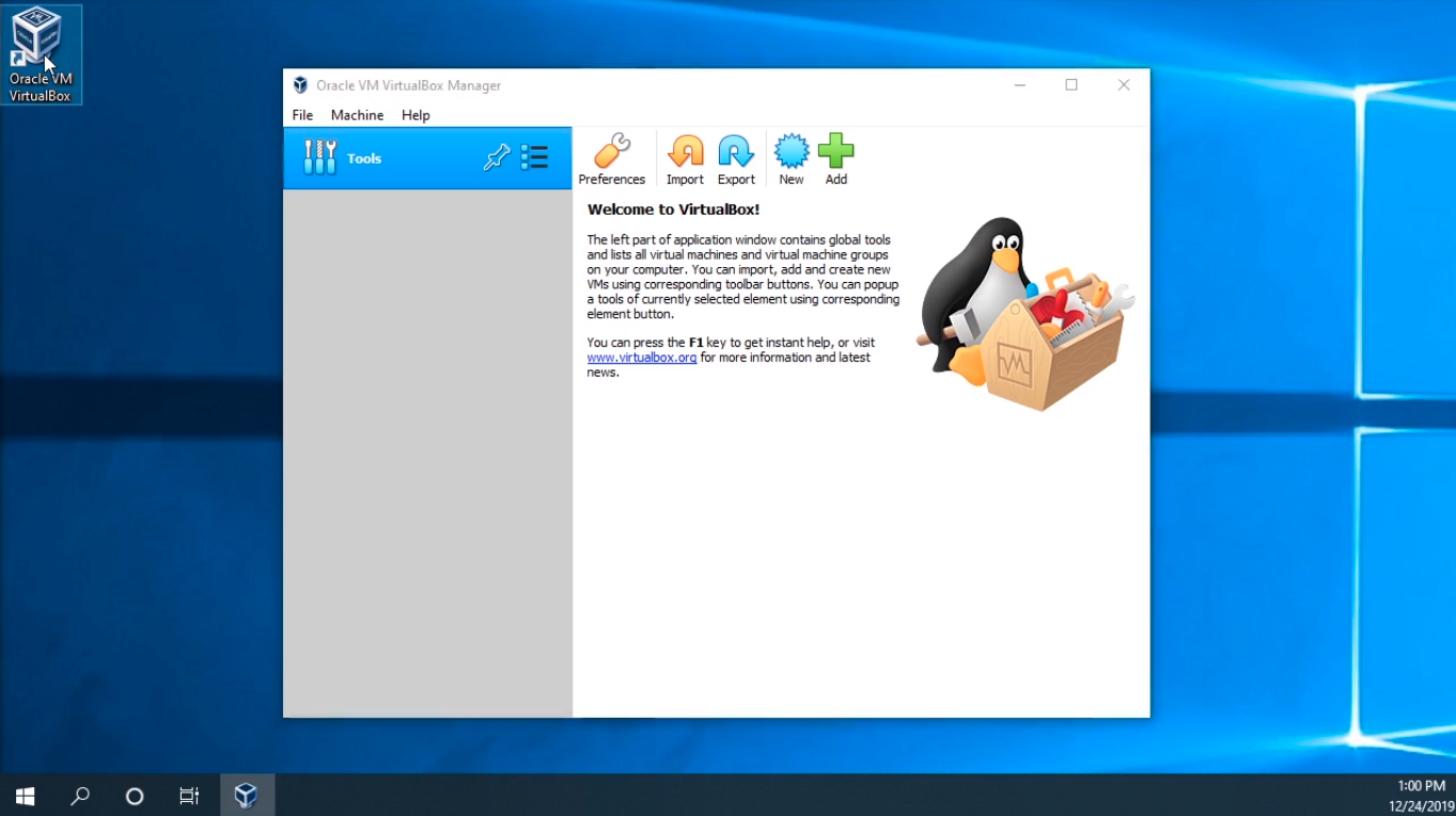 First, open VirtualBox by double-clicking on the shortcut icon on the Desktop that gets created when you install VirtualBox.
