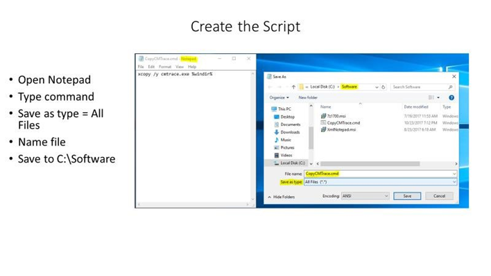 - **Open Notepad, now let’s create the script **• **Type **xcopy /y cmtrace.exe %windir%