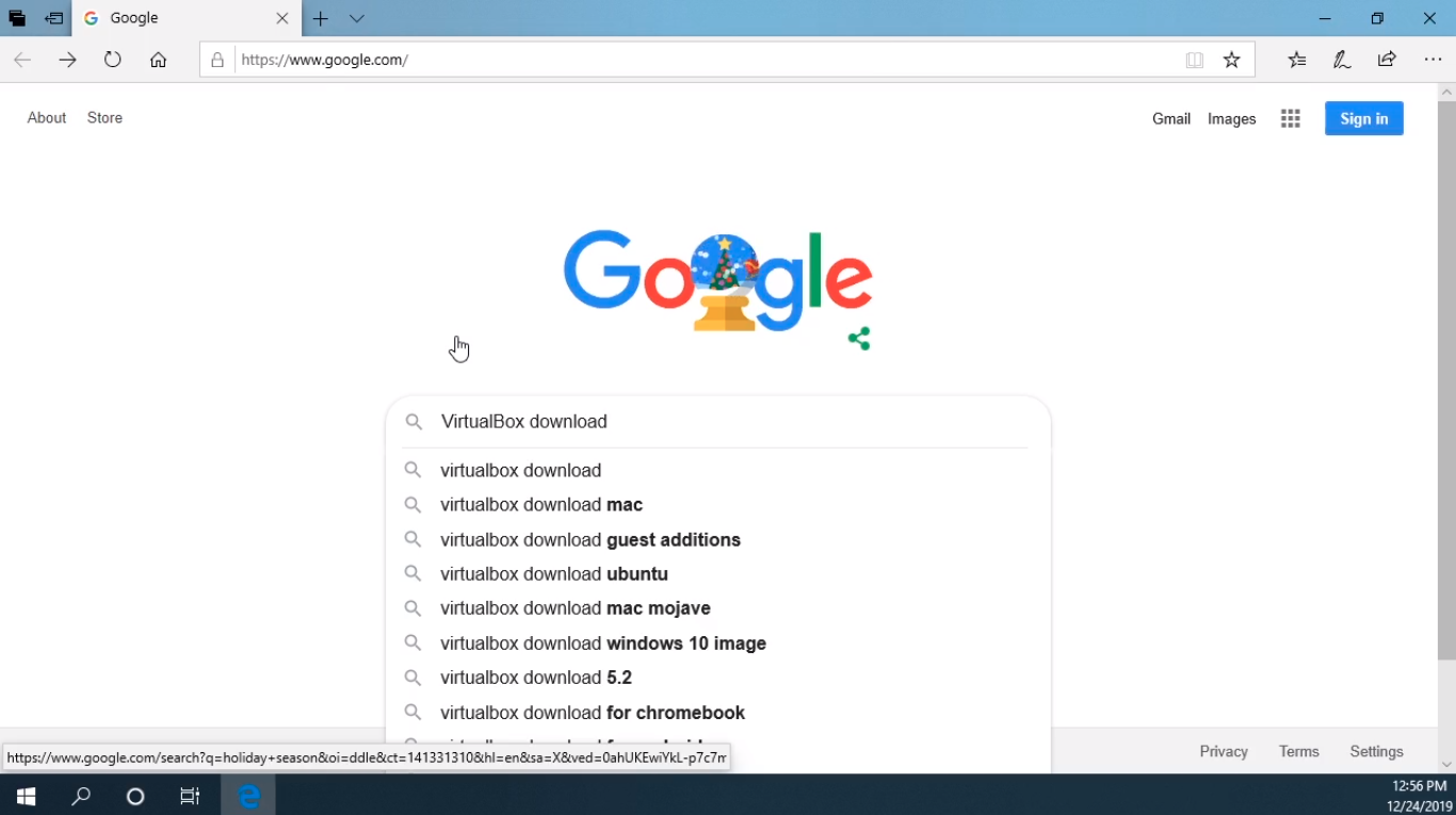 So, the first thing we are going to do is go to https://www.google.com. Next, in the search box, we are going to search for VirtualBox download and press Enter.