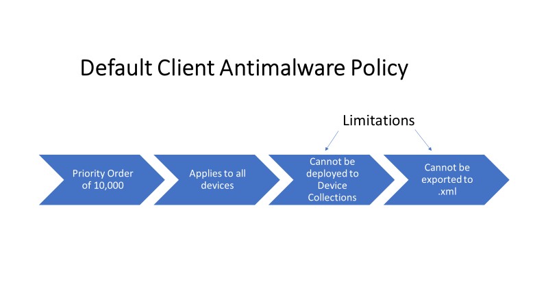 - In configuration manager Endpoint Protection, you can use the default antimalware policy to deploy these settings to every device in your organization or you can create a custom policy and deploy settings to individual device collections in your organization.