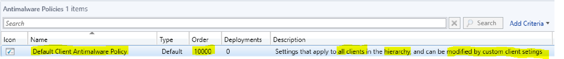 - Notice that the Default Client Antimalware Policy has a priority order value of 10,000 We will talk more about priority orders in a moment.