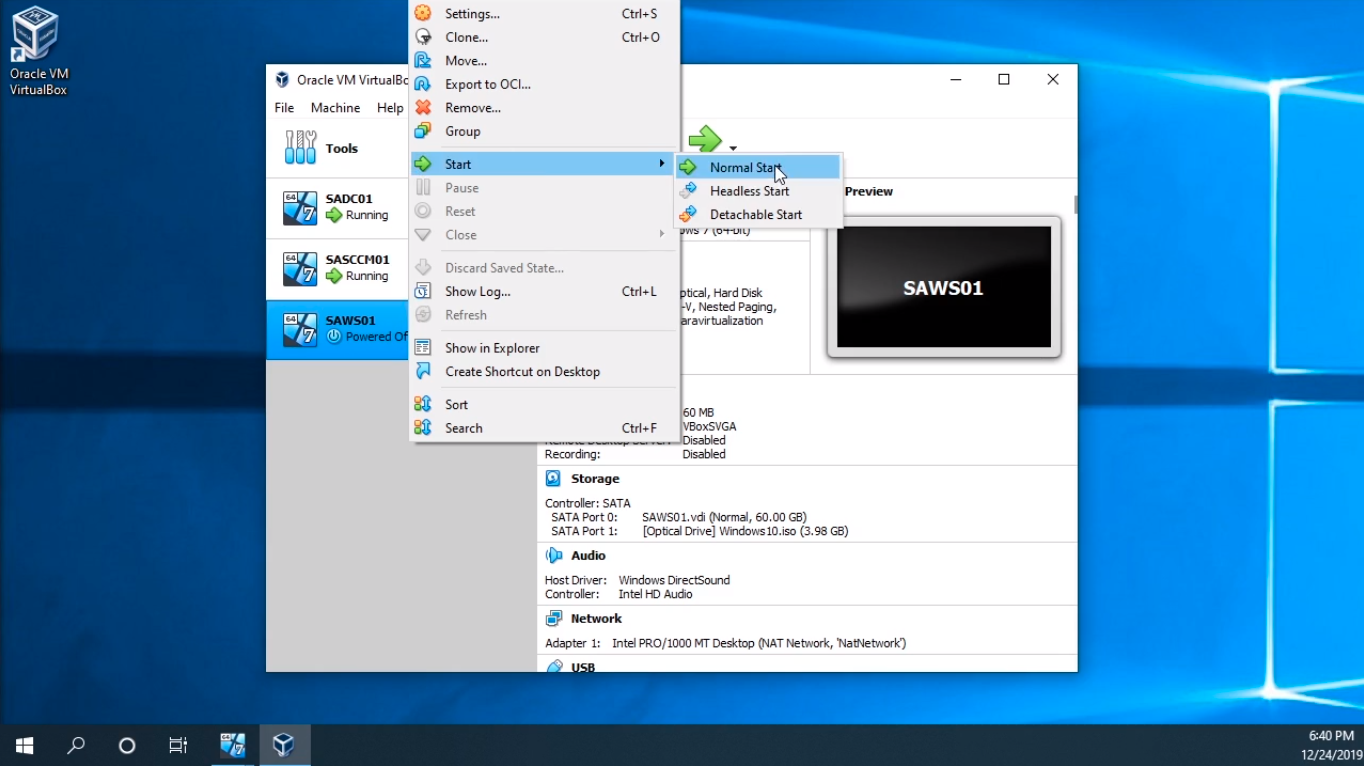 What I am going to do is right-click on the VM and I am going to choose Start and choose Normal Start.