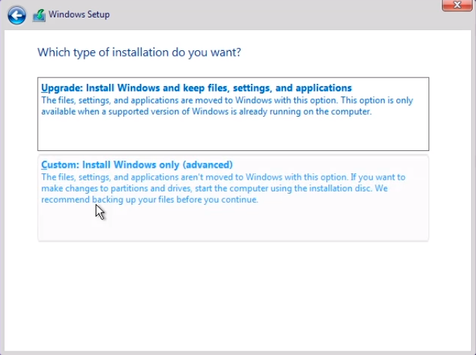 I am going to choose Custom because this is the first installation of Windows on this Hard Drive.