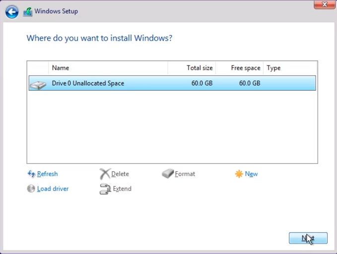 Here I am going to select Drive 0 Unallocated Space and click Next.