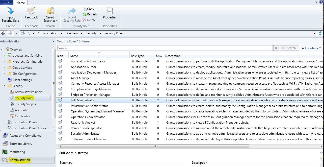 To access the built in security roles, open configuration manager, from the workspace, click Administration, from the Navigation Pane click Security, then click Security Roles. Displayed are the fifteen Security Roles. In another lecture we will assign a user collection to the Full Administrator security Role.
