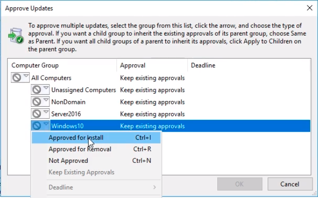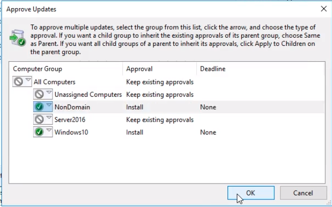 And we can approve these to our Windows 10 Group by clicking on the drop-down and selecting Approved for Install. Doing the same for NonDomain Group since we have some Windows 10 workstations not joined to the domain.
