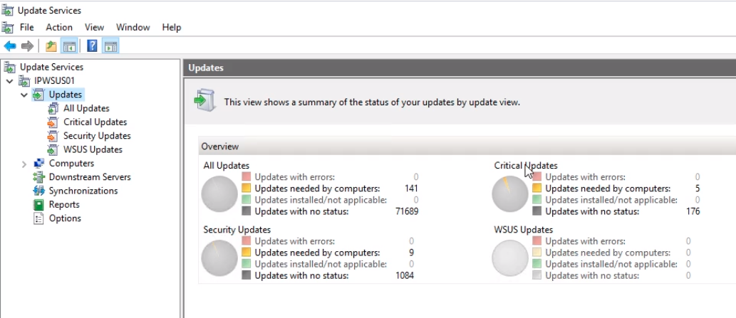 Open WSUS Console and go to the Updates tab. The first thing we can see is the Overview section in the center pane with All Updates, Critical Updates, Security Updates, and WSUS Updates.