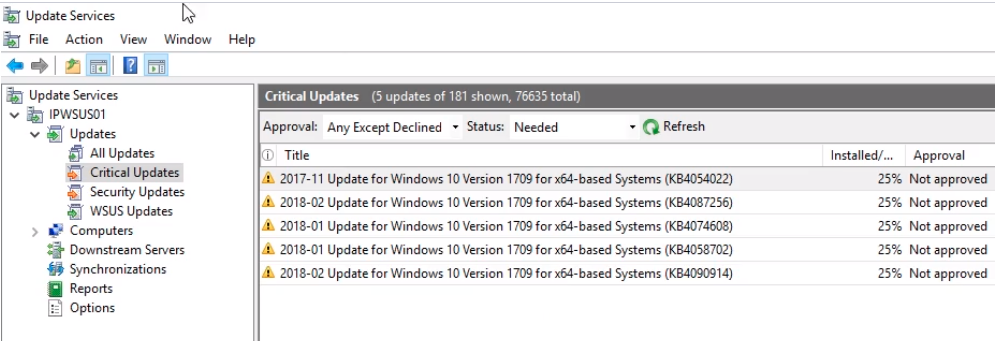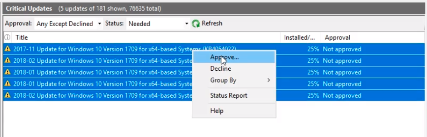 WSUS will show us those 5 updates which we will need to approve. These are all for Windows 10.
