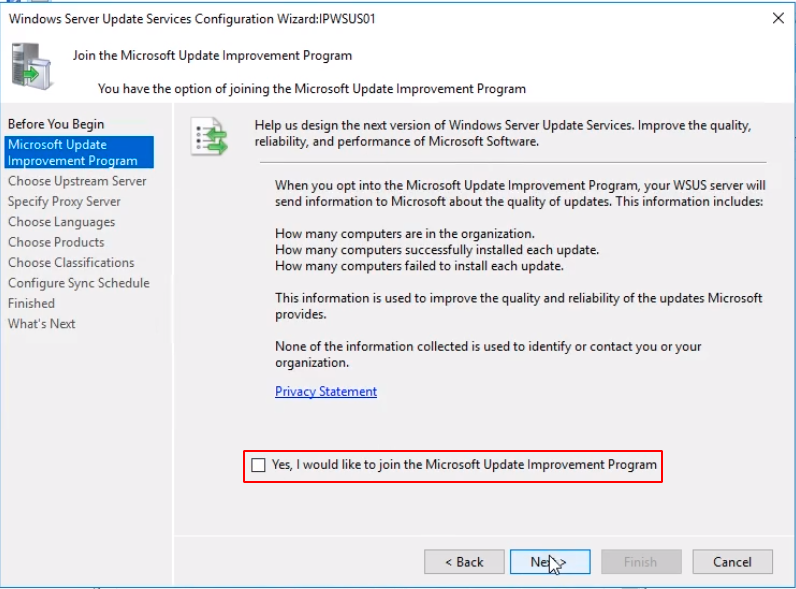 We have the option to opt into the Microsoft Update Improvement Program. Since we are in a lab environment we are going to uncheck that option.