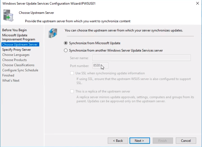 Now we need to Choose Upstream Server. We choose the radio button to Synchronize from Microsoft Update. Click Next to continue.