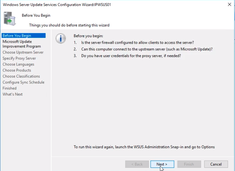 Now, we notice that when opening it we have a wizard that is asking us to configure WSUS.